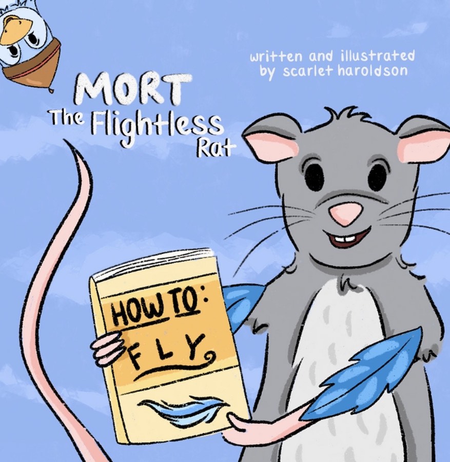 Mort the rat looks at the book he helped inspire "Mort the Flightless Rat." The book was written and illustrated by Scarlet Haroldson, a 19-year-old East Lansing resident. (Courtesy photo)