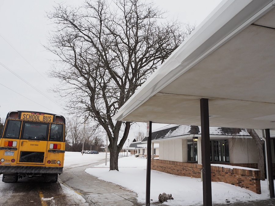 Even the building’s overhang, meant to shield students, many of which utilize wheelchairs and other mobility devices, was built too short to allow buses to pull underneath, so students and staff are left exposed to rain and snow at dismissal. The overhang bears the signs of several attempts by buses to get underneath.