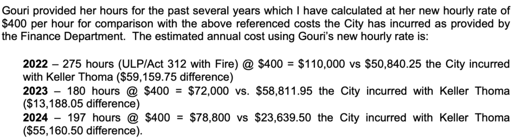 In the agenda packet, it explains that if Sashital’s rate had been $400 the previous three years, the city would have spent close to $130,000 more on its labor attorney.