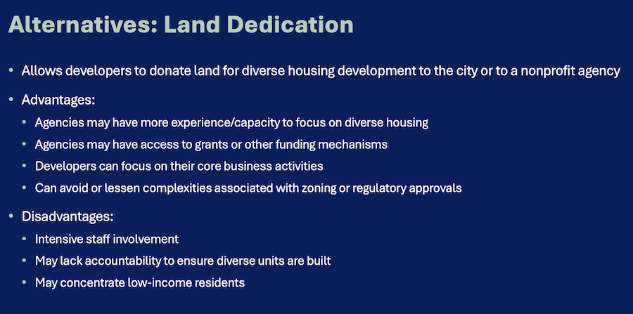 Bartley said it’s not clear how a land dedication would translate for a developer to meet the diverse housing requirement, but this is a strategy other cities have used.
