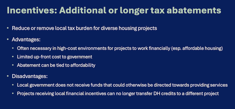This incentive would reduce or remove local taxes on housing developments downtown for some time period.