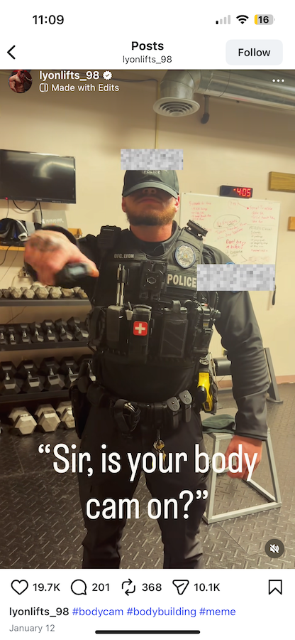 In a video Lyon posted Jan. 12, the words “Sir, is your body cam on?” flash on the screen before Lyon, in his police uniform, takes the body camera off and drops it.