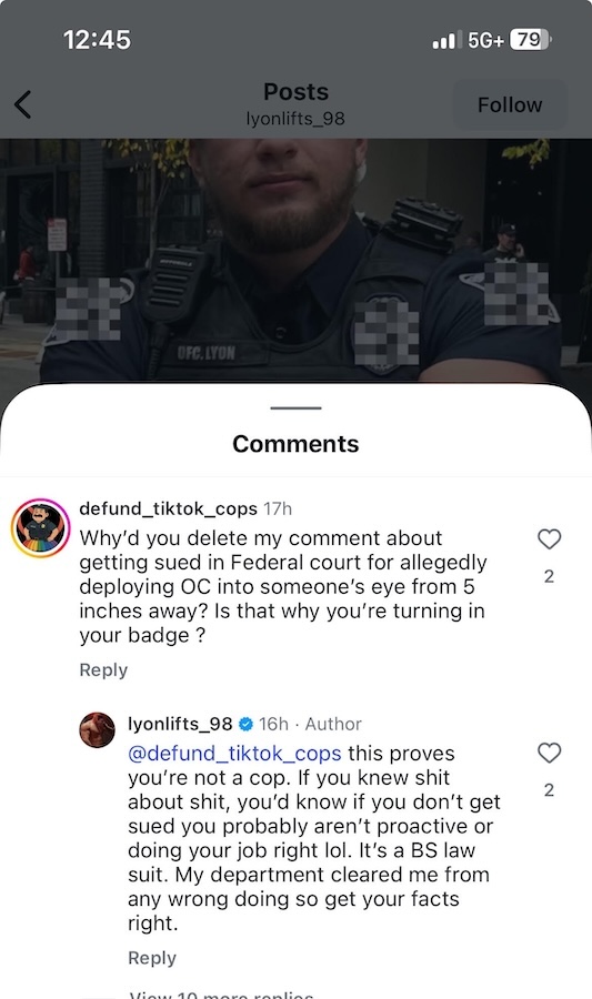 Under a since-deleted post, Lyon responded to a comment that brings up the lawsuit. He wrote that if an officer isn’t being sued, they probably aren’t doing their job right.