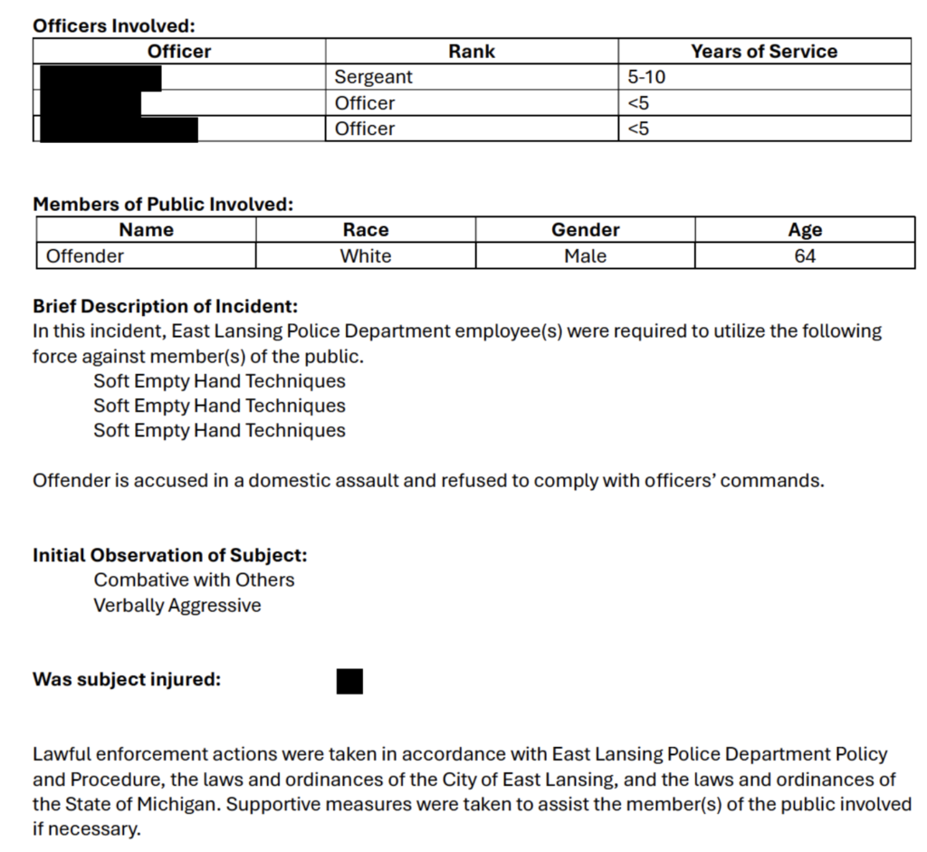 Early last year, ELPD stopped including officer names in reports after the bargaining agreement was reached. Later, the police department began including officer names in the reports but told the commission the reports must be kept confidential because officer names have been included. East Lansing Info has been able to receive redacted versions of these reports through Freedom of Information Act requests, but the information included in the reports has been significantly whittled down in recent months.