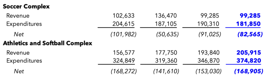 Other facilities like the soccer and softball complexes have had a net negative impact on the budget in recent fiscal years. However, residents previously approved bonds to pay for these facilities. Drwencke said the last bond was paid off in about 2016, and there has not been a dedicated funding source to operate these facilities since.