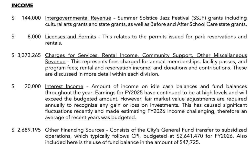 It’s hard to pinpoint what services in the Parks and Recreation Department could be at risk because the department’s expenses are spread across many facilities and programs. Short of mass staffing cuts or closing the Hannah Community Center – which would have broader impacts because it hosts employee offices, city activities and city meetings – there isn’t a single budget item that would significantly chip away at the city’s deficit if it were eliminated.